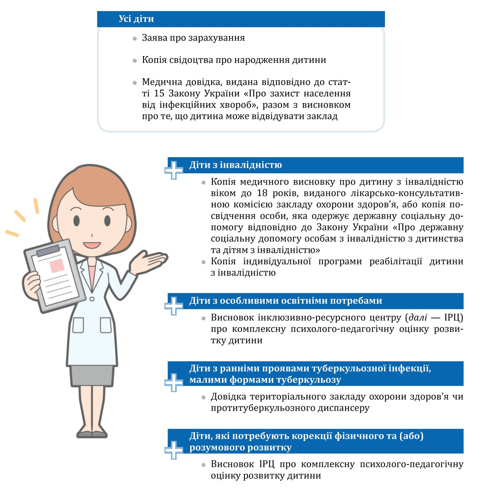 оригінал висновку з аудіограмою лікаря-сурдолога або лікаря-отоларинголога дитячого (для дітей з функціональними мовленнєвими труднощами та дітей з функціональними сенсорними труднощами, що передбачають обмеження слухової функції), висновок лікаря-офтальмолога дитячого (для дітей з функціональними сенсорними труднощами, що передбачають обмеження зорової функції) та висновок лікаря-невролога (ортопеда) дитячого (з функціональними моторними або фізичними труднощами);