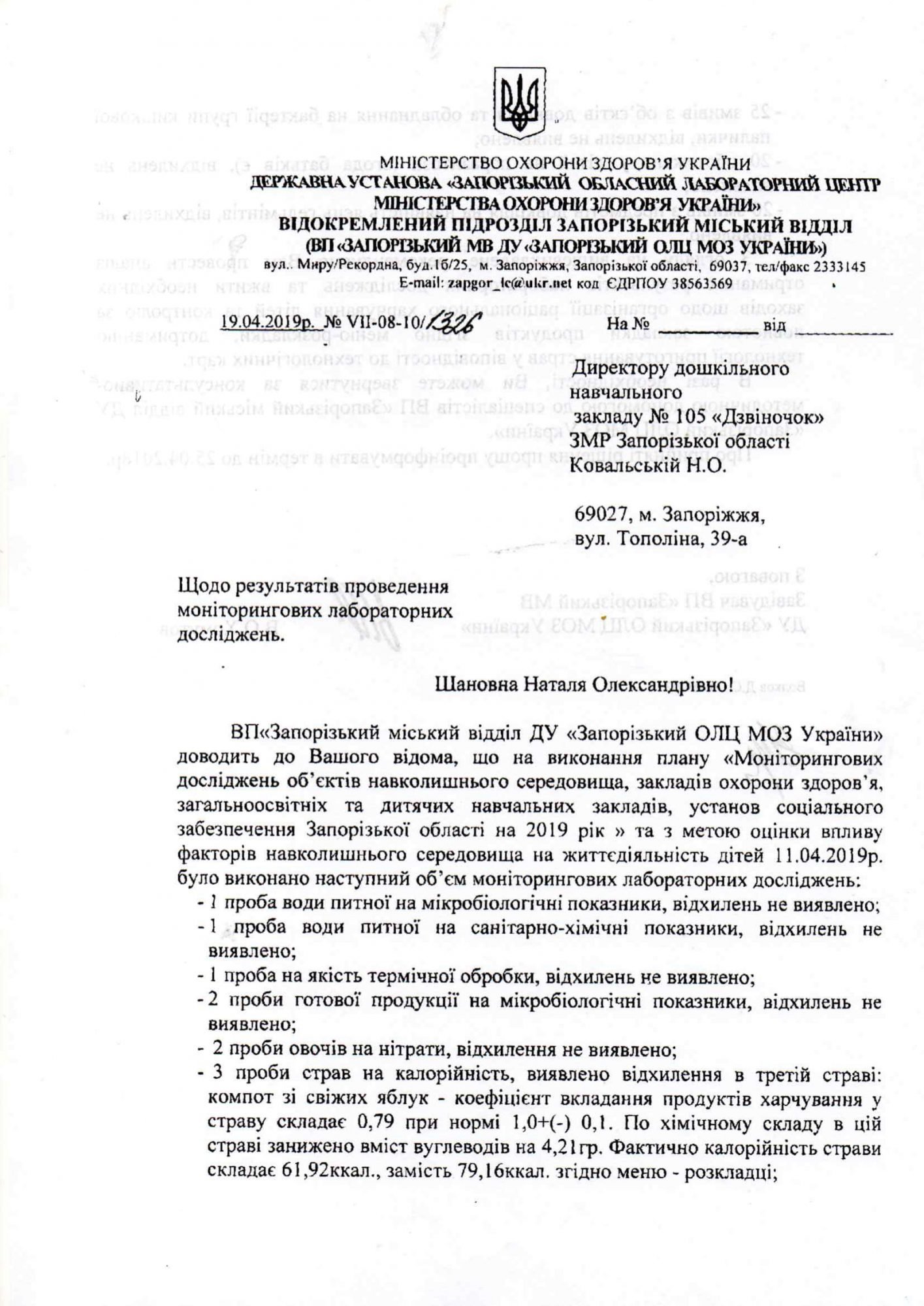 Результати моніторингових лабораторних досліджень від 19.04.2019 року.