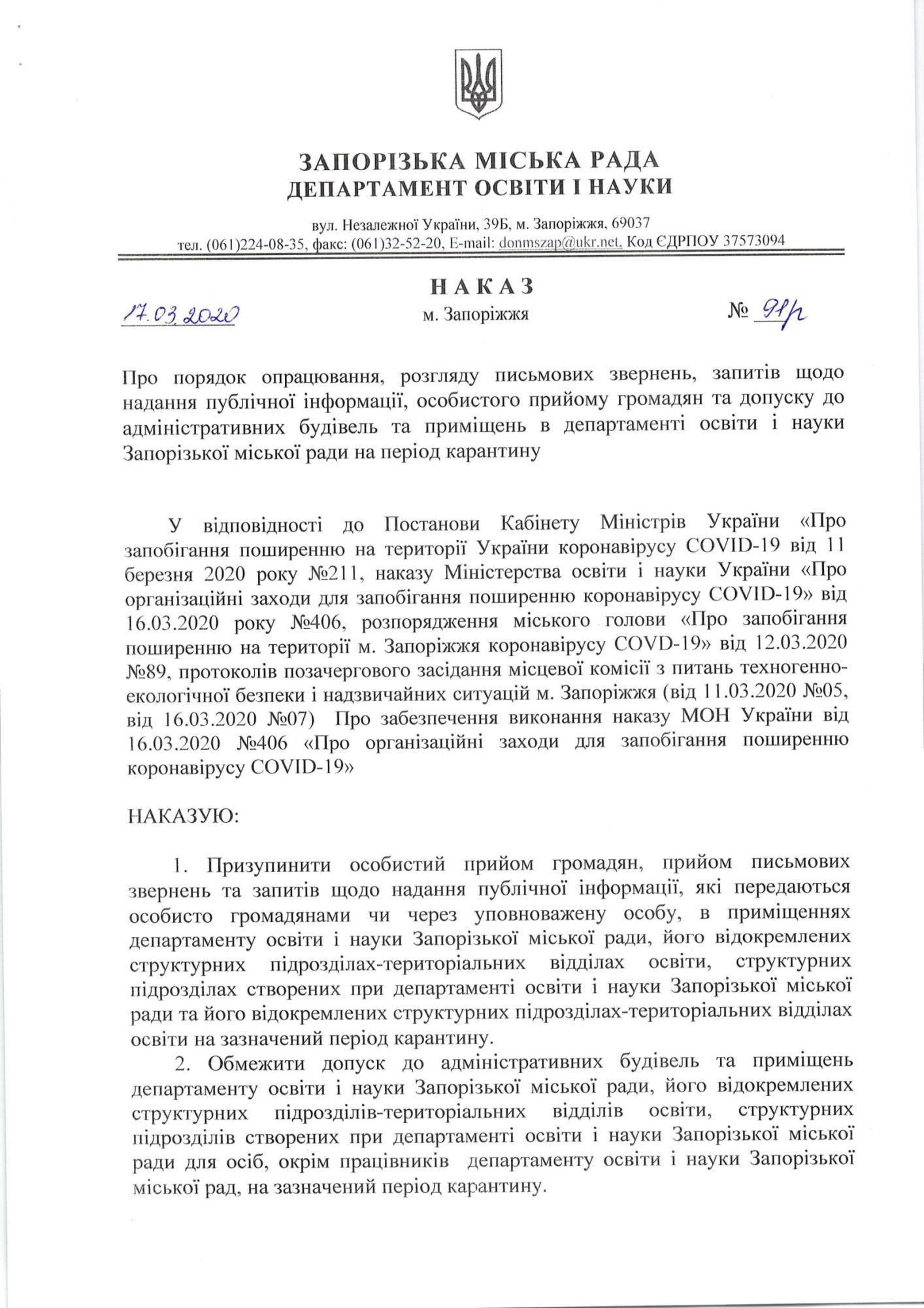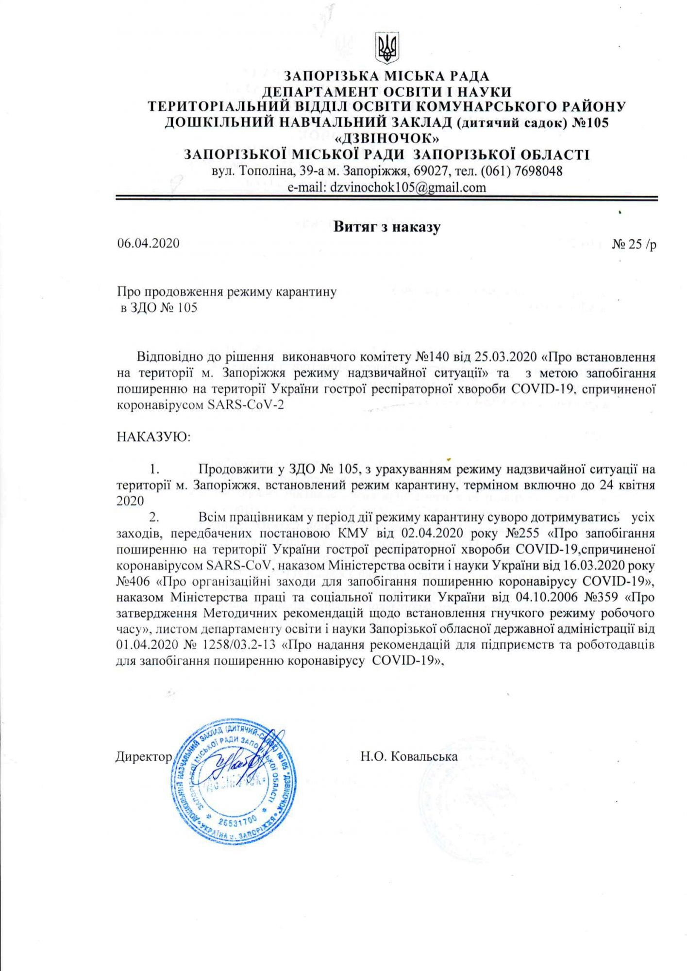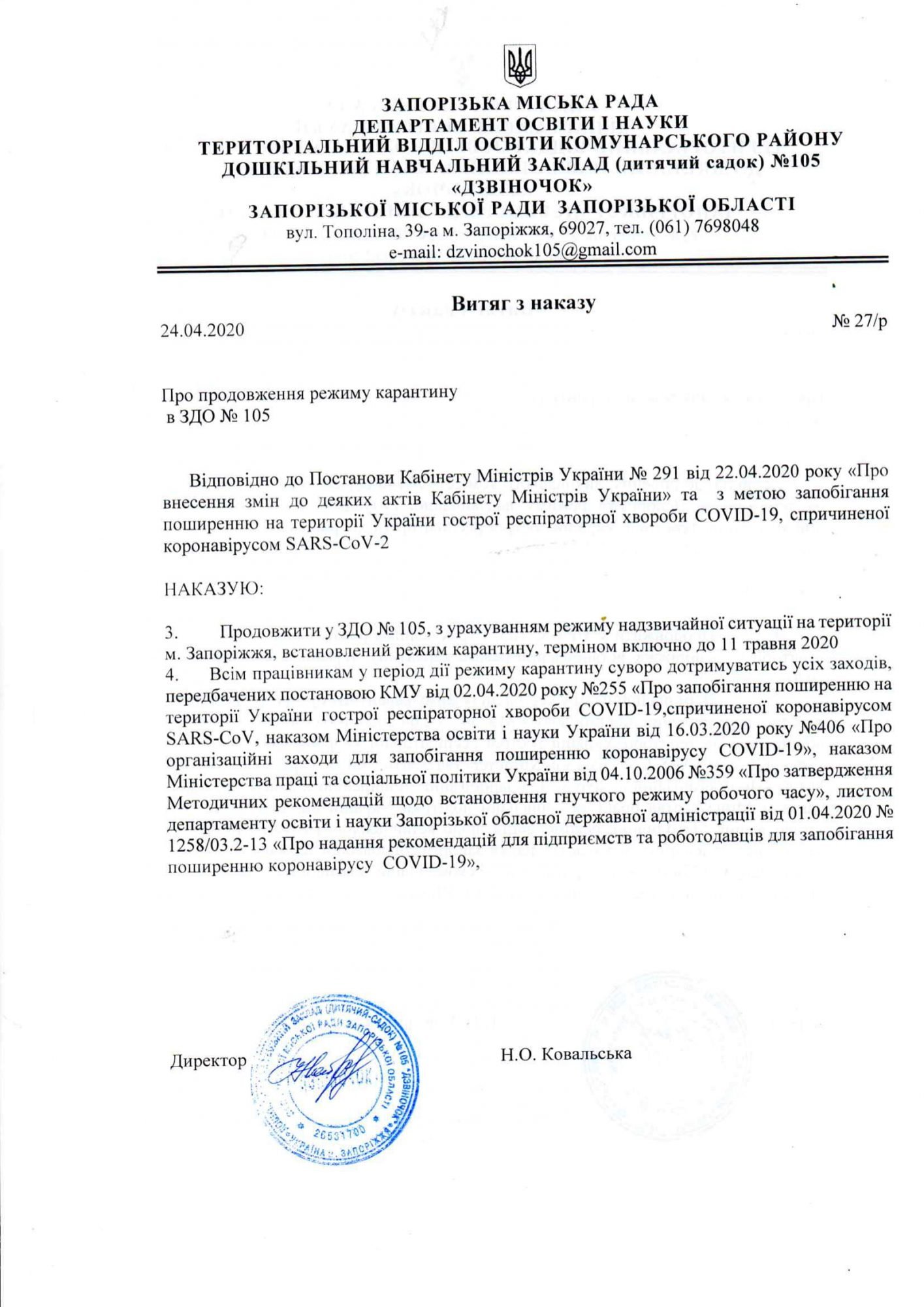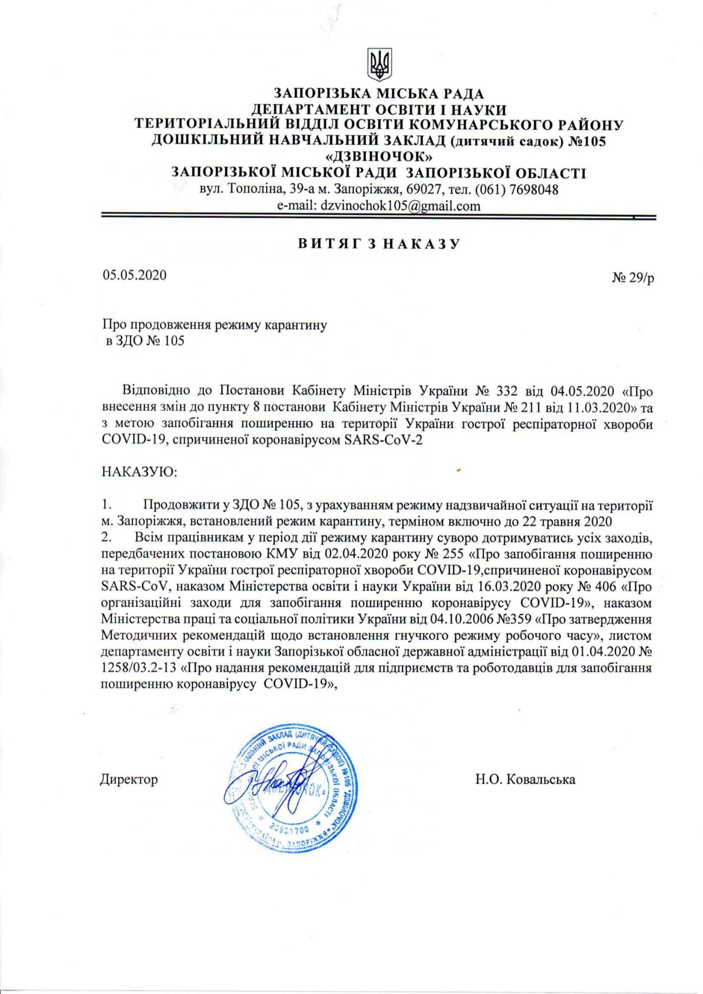Загальнонаціональний карантин продовжено до 22 травня 2020 року з деякими послабленнями з 11 травня 2020 року– відповідне рішення Уряд ухвалив 04 травня 2020 року. Всі заклади освіти продовжують працювати з використанням технологій дистанційного навчання.